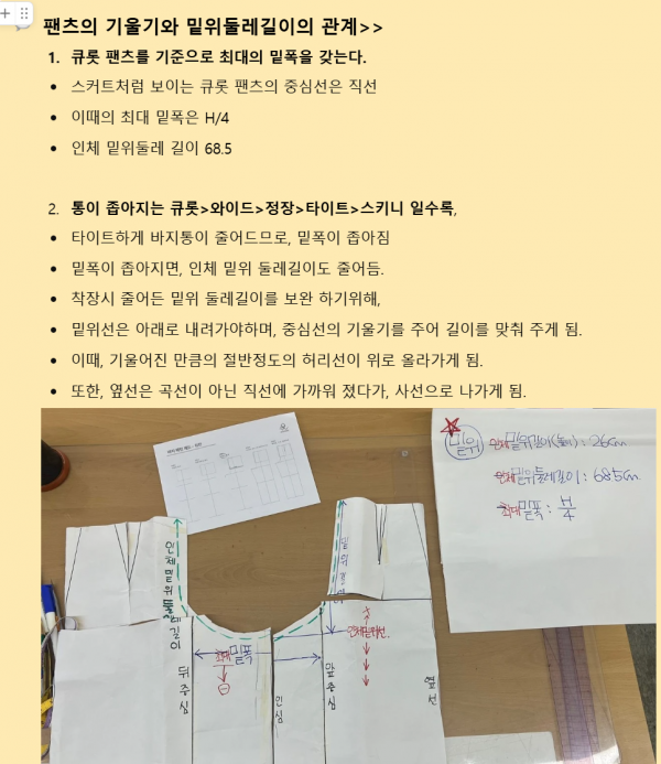 바지는 통이 좁아질수록 밑위 둘레 길이를 보완하기 위해 밑위선이 내려가고 중심선 기울기를 조정해준다는 점에 대해 이해할수 있었습니다.