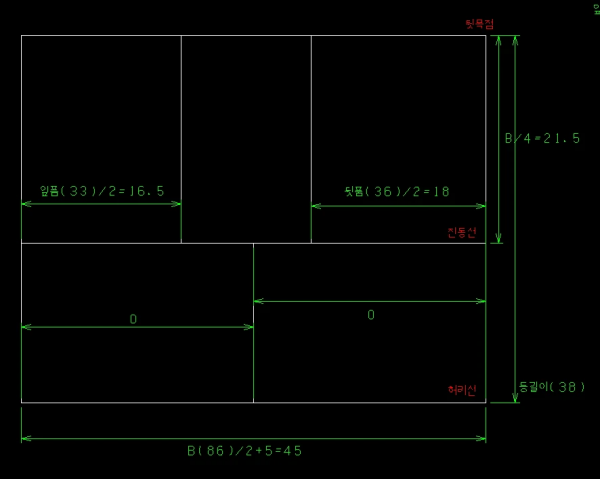 상의는 등길이와 가슴둘레를 기준으로 기초 박스를 그리고, 옆선(B/4), 뒤품, 앞품을 표시해 줍니다.