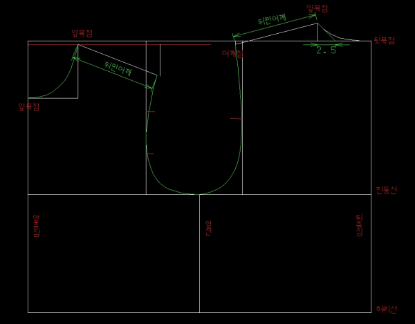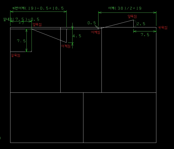 뒤판은 뒷목점과 옆목점을 잡은 뒤 어깨길이를 반영해 어깨선을 내리면 대략적인 형태가 완성됩니다.
