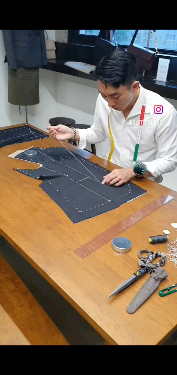 게싱과 앞판의 연결 시침을 통해 앞판에 가슴분량과 라펠의 꺽임에 필요한 여유 아랫단이 앞으로 뒤업어지지 않게 하기위한 여유량등을 확보하는 작업을 진행하였다 마찬가지로 실습과 복습과정을 혼자 거치면서 다시금 상기 시키는 시간을 가졌고 맞춤재단과 맞춤봉제를 별도로 두지않고 배운 두가지를 하나로 묶어 완성 시키기위해 가봉과 완성 봉제까지 조금씩 진행할 계획을 가졌다