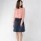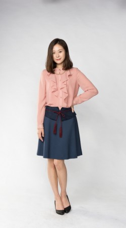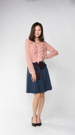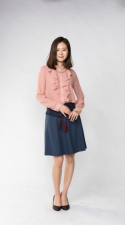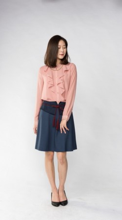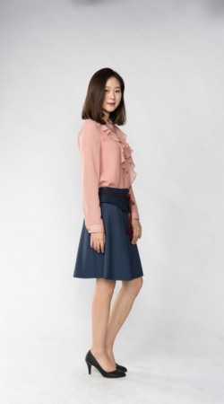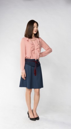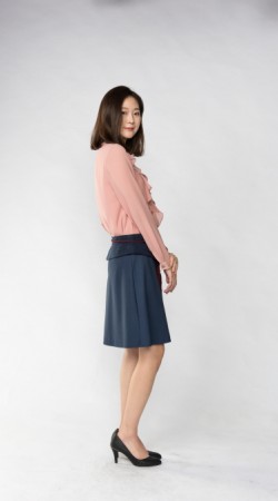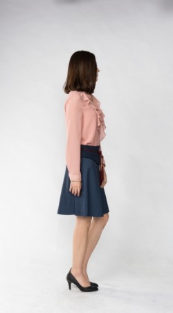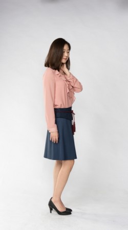 예쁜 라인으로 적당히 퍼진 플레어스타일 스커트에 허리 부분만 스웨이드 원단으로 배색을 준 것이 포인트 입니다.